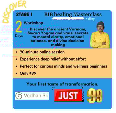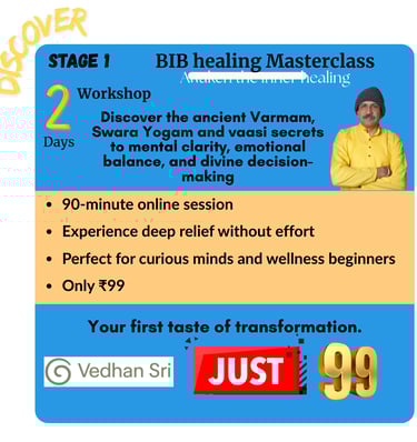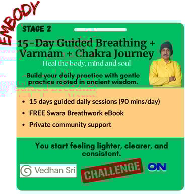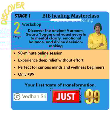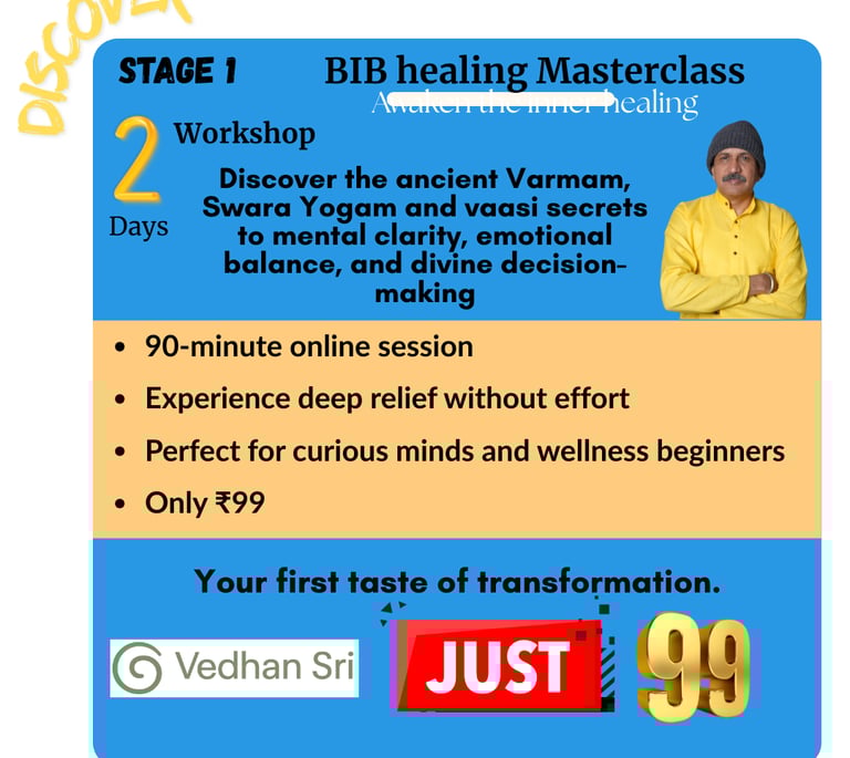 🎓 Mentor to Over 5,000 Students — teaching the practical application of Swara Yogam, Varmam therapy, and energy-based healing through his programs and retreats.